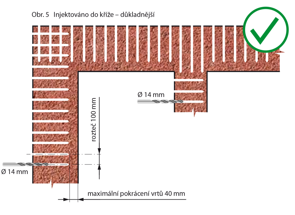 Iniekcja od zewnętrznej strony narożnika z odskokiem. Końce otworów nie mogą znajdować się dalej niż 100 mm od prostopadle nawiązującego pierwszego otworu drugiego muru.